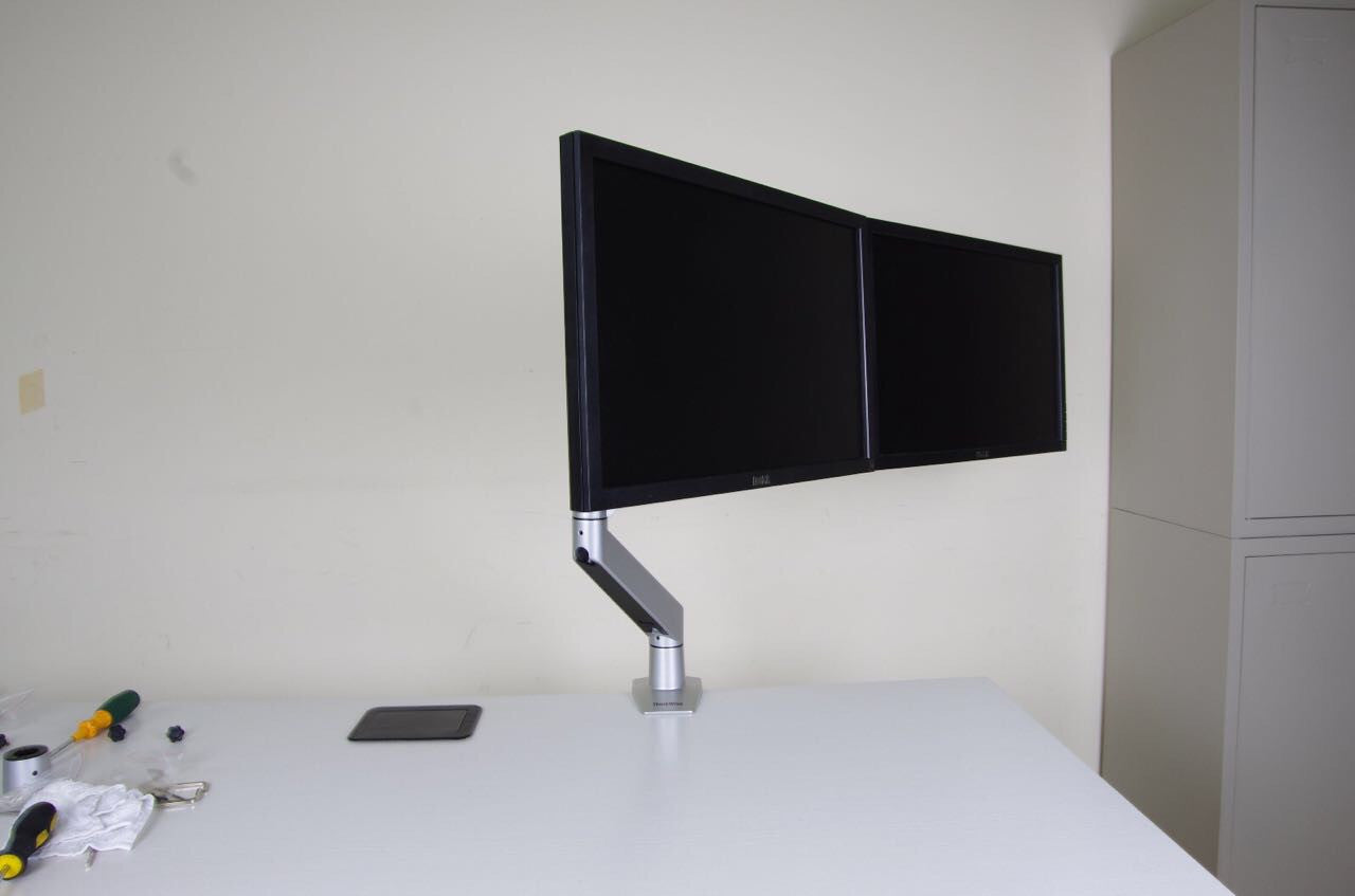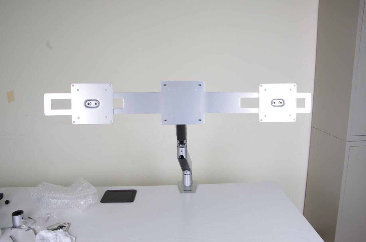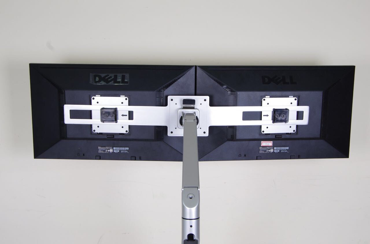 Dual Monitor Arm for Heavy Monitors utilizes a smart, versatile crossbar design to enhance dual monitor set-ups. Two 24" monitors (VESA 75mm and 100mm) weighing a combined 8 to 20 kg are supported by the by this ,Dual Monitor Arm. These monitors can be positioned anywhere along the 760 mm crossbar and can also be rotated 180º for either landscape or portrait orientation. They can also be tilted +75/-45º and extended out 26.7". The arm itself features rotation at two points and has a height adjustment range of 340. It mounts to your work surface using either a Desk Clamp or a Grommet Mount (both included). The Desk Clamp mounts to surfaces
